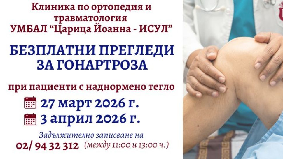 БЕЗПЛАТНИ ПРЕГЛЕДИ ЗА ГОНАРТРОЗА ПРИ ПАЦИЕНТИ С НАДНОРМЕНО ТЕГЛО В УМБАЛ „ЦАРИЦА ЙОАННА – ИСУЛ“
