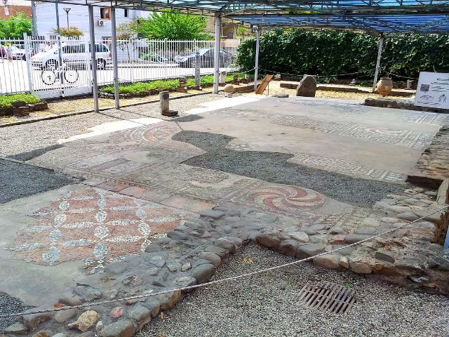 Геометрични и декоративни мотиви върху подове и фрагменти — типични за античната мозайка.